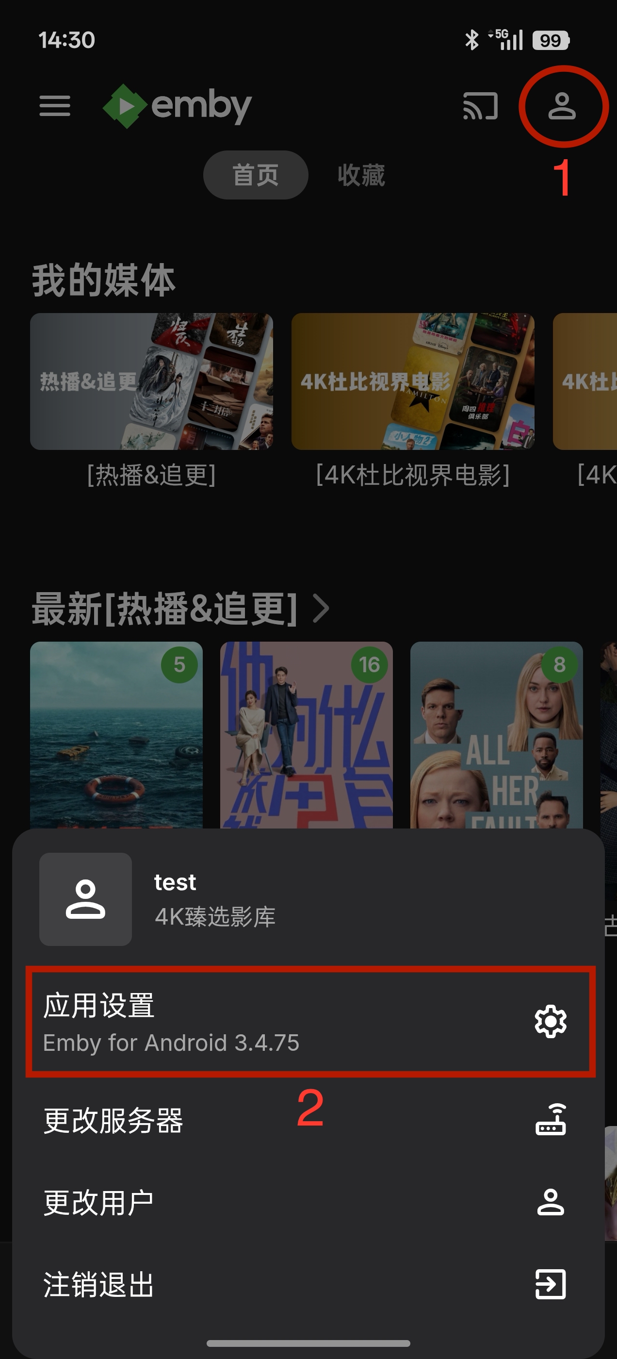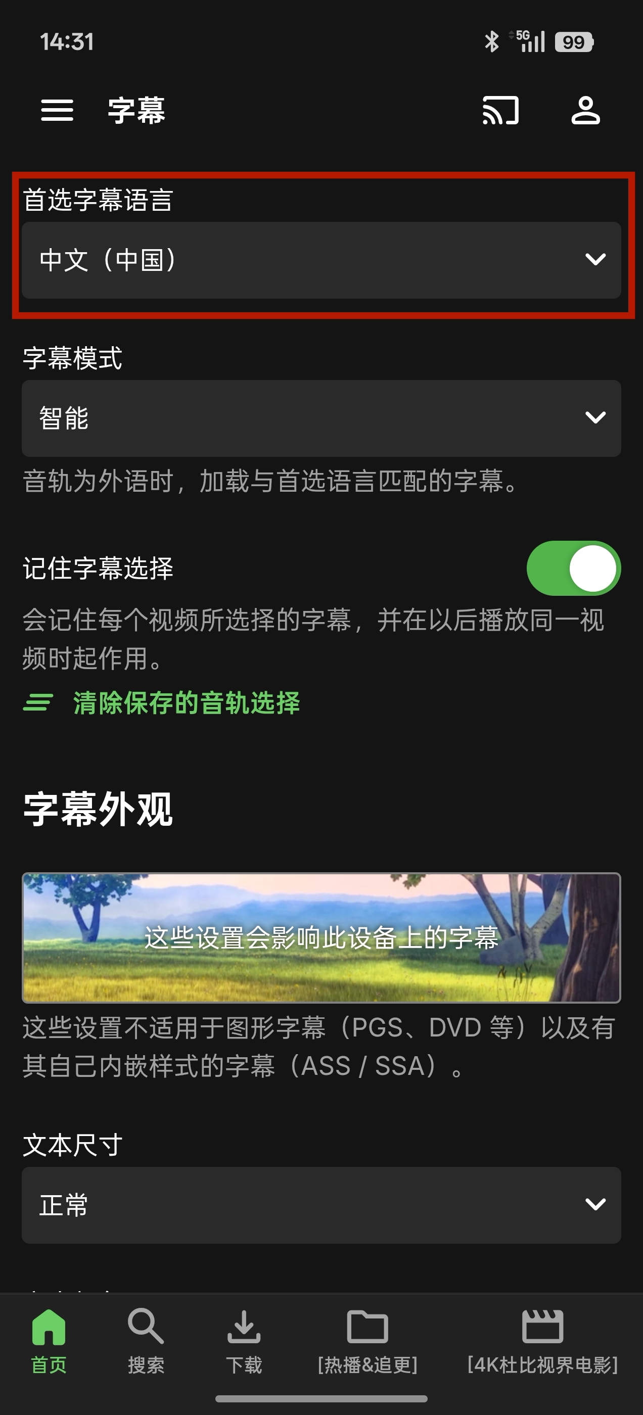 进入媒体库首页,先点右上角的“小人”,再点“应用设置”去设置一下首选字幕。