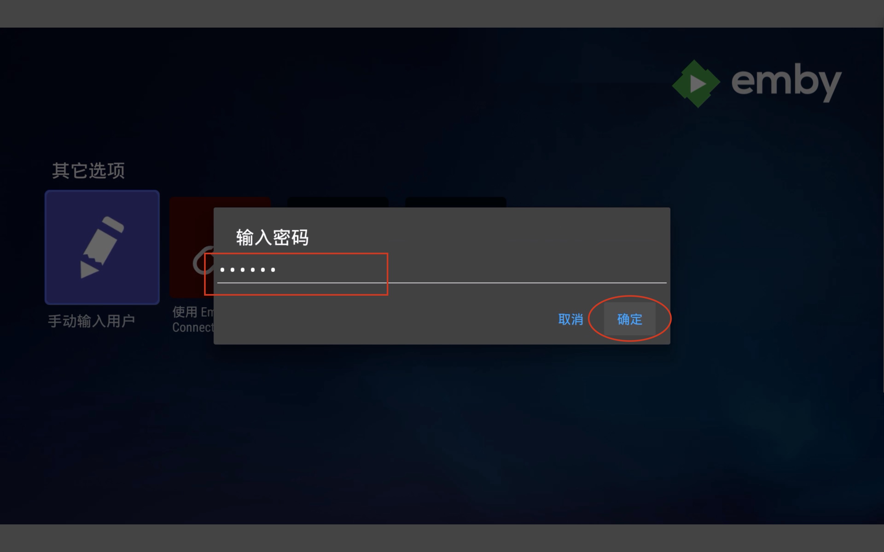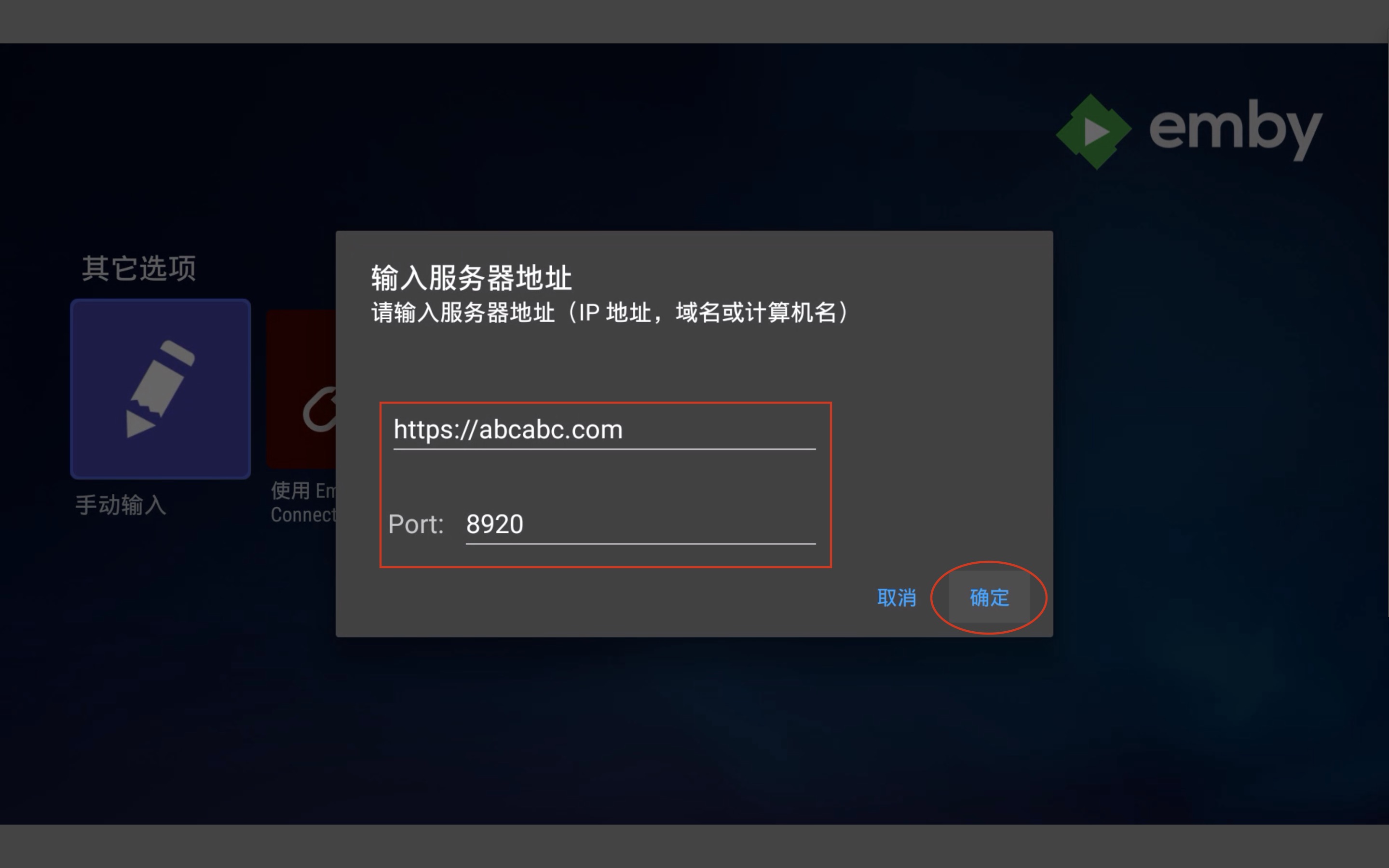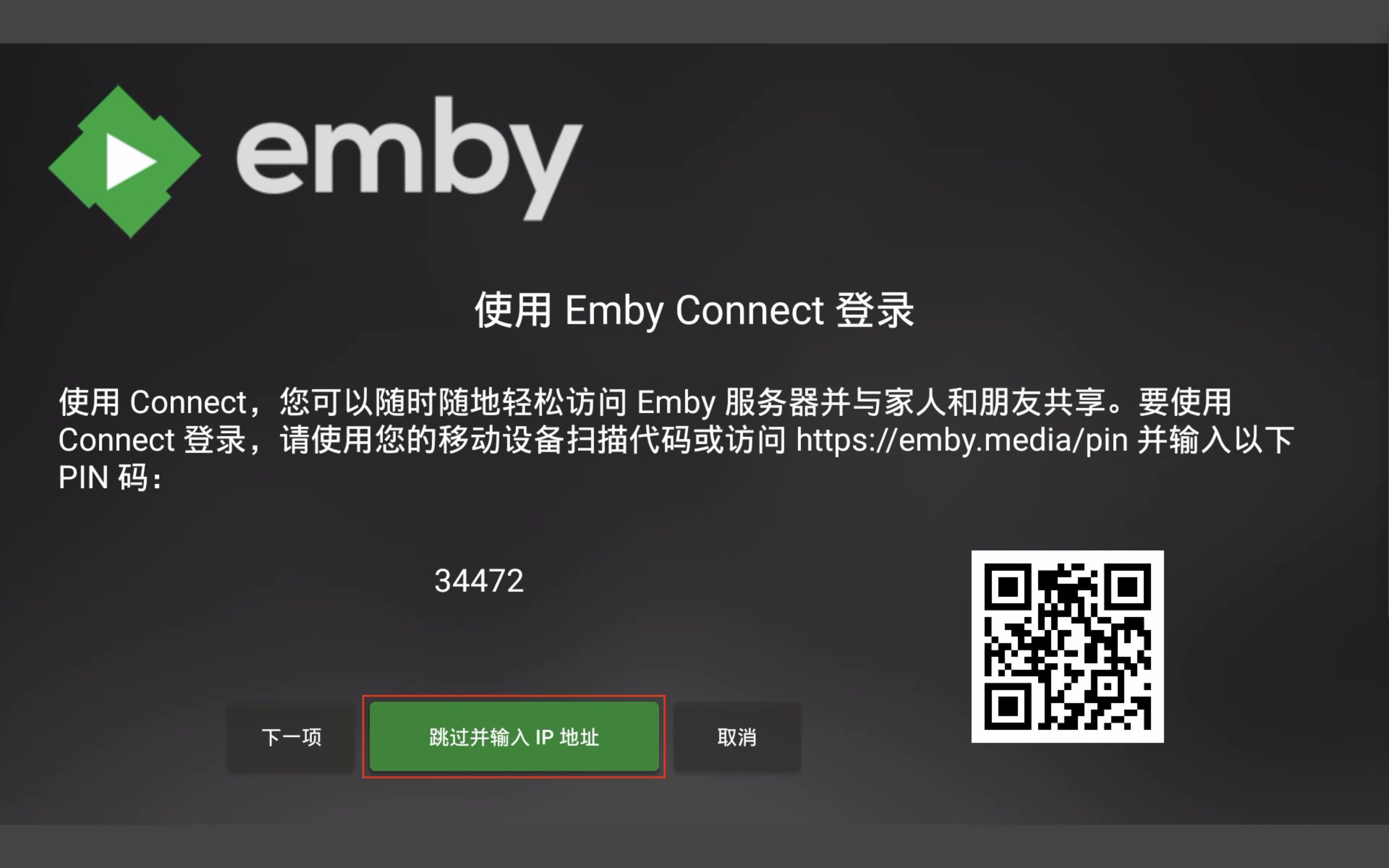 打开Emby点选“跳过并输入IP地址”